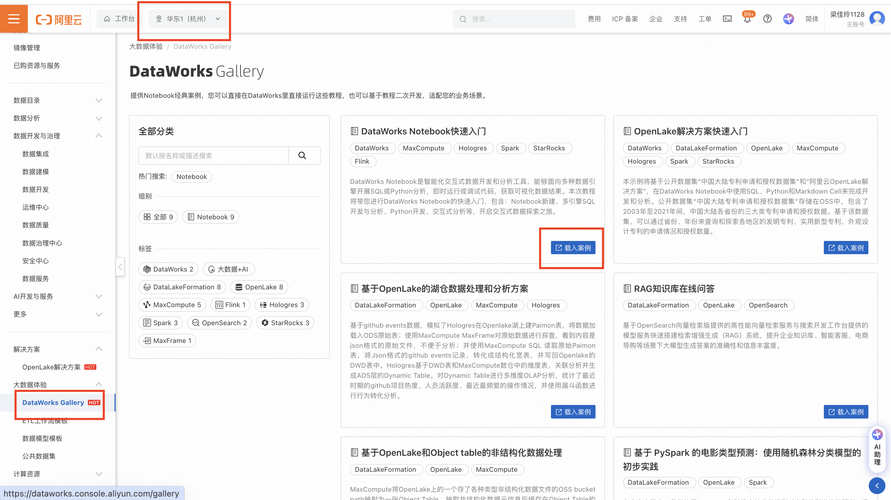 选择大数据体验下的DataWorks Gallery,点击Notebook快速入门的载入案例