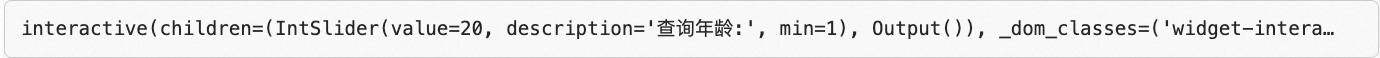 from ipywidgets import interactive,IntSlider query_age = 20 def f(age): global query_age query_age = age interactive(f, age=IntSlider(value=20, min=1, max=100, step=1, description='查询年龄:'))