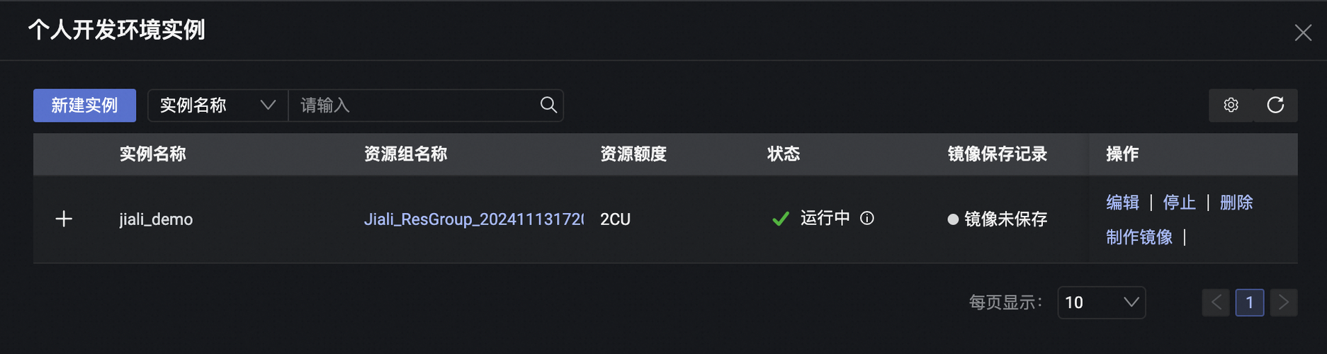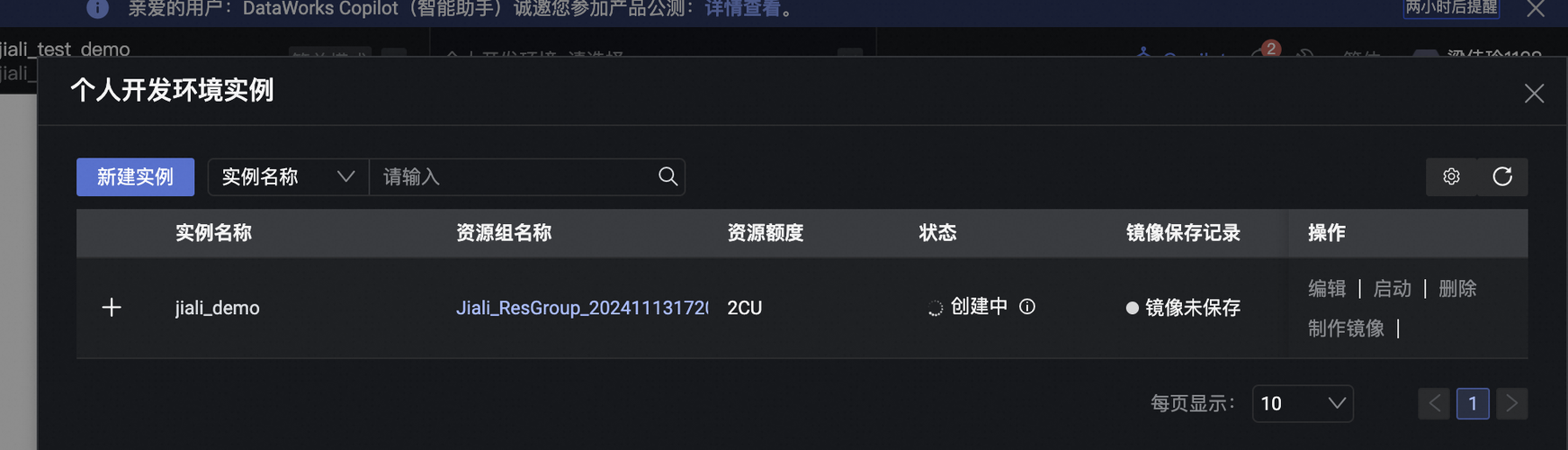 - 填写完实例信息后点击确定,显示个人开发环境创建中