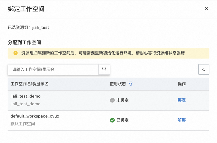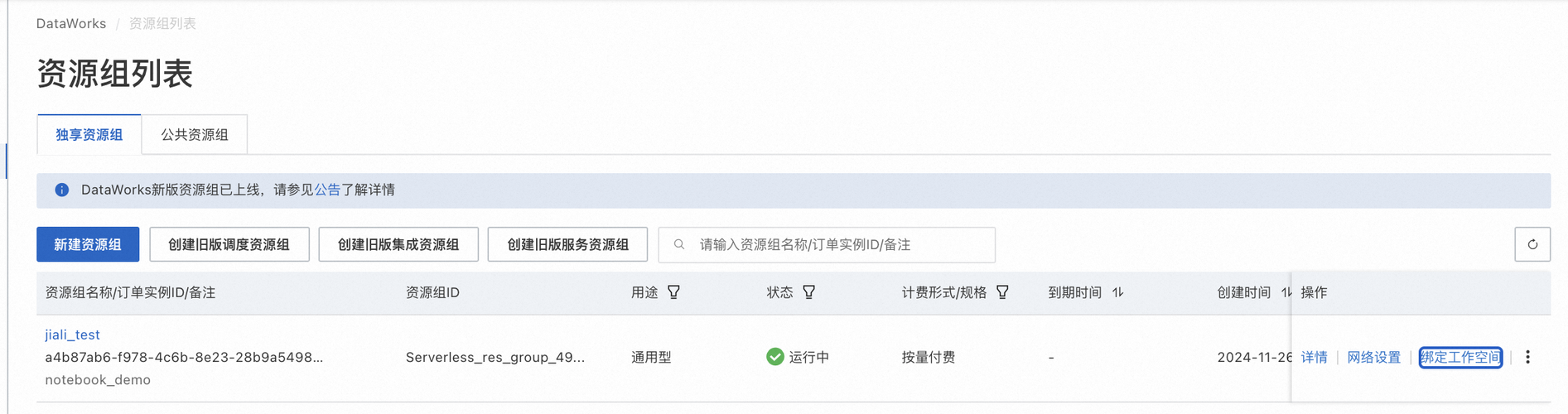 - 若之前没有创建过资源组,则按照指引新建资源组,并绑定到刚刚创建的工作空间上。