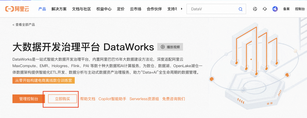 进入大数据开发治理平台DataWorks产品详情页,如未登陆需要登陆阿里云账号,点击立即购买按钮进入DataWorks购买页。