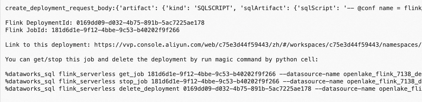 -- @conf name = flink_vvp_job_quick_start -- @conf engineVersion=vvr-8.0.8-flink-1.17 -- @conf flinkConf."execution.checkpointing.interval"=10second -- @conf flinkConf."taskmanager.numberOfTaskSlots"=4 -- @conf flinkConf."table.exec.state.ttl"=1hour -- @conf flinkConf."execution.checkpointing.min-pause"=10second -- @conf streamingResourceSetting.resourceSettingMode=BASIC -- @conf streamingResourceSetting.basicResourceSetting.parallelism=4 -- @conf streamingResourceSetting.basicResourceSetting.taskmanagerResourceSettingSpec.memory=4GiB -- @conf streamingResourceSetting.basicResourceSetting.taskmanagerResourceSettingSpec.cpu=1 -- @conf streamingResourceSetting.basicResourceSetting.jobmanagerResourceSettingSpec.memory=4GiB -- @conf streamingResourceSetting.basicResourceSetting.jobmanagerResourceSettingSpec.cpu=1 --创建临时源表datagen_source。 CREATE TEMPORARY TABLE datagen_source( randstr VARCHAR ) WITH ( 'connector' = 'datagen' -- datagen连接器 ); --创建临时结果表print_table。 CREATE TEMPORARY TABLE print_table( randstr VARCHAR ) WITH ( 'connector' = 'print', -- print连接器 'logger' = 'true' -- 控制台显示计算结果 ); --将randstr字段截取后打印出来。 INSERT INTO print_table SELECT SUBSTRING(randstr,0,8) from datagen_source;
