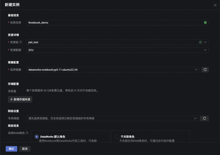 - 创建个人开发环境实例,给实例命名,并选择资源组,设定资源配合,最小2CU即可满足实验要求。