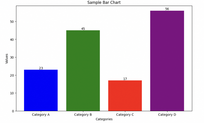 import matplotlib.pyplot as plt # 数据准备 categories = ['Category A', 'Category B', 'Category C', 'Category D'] values = [23, 45, 17, 56] # 创建柱状图 plt.figure(figsize=(10, 6)) # 设置图形大小 plt.bar(categories, values, color=['blue', 'green', 'red', 'purple']) # 绘制柱状图,可自定义颜色 # 添加标题和轴标签 plt.title('Sample Bar Chart') plt.xlabel('Categories') plt.ylabel('Values') # 显示数值 for i in range(len(values)): plt.text(i, values[i], str(values[i]), ha='center', va='bottom') # 在每个柱子下方显示数值 # 显示图形 plt.show()