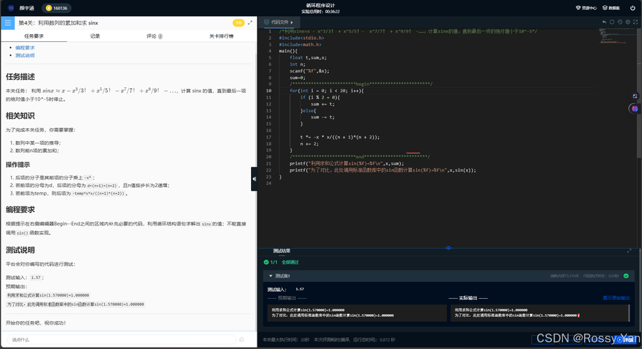 int main() { double x = 1.57; // 以某个x值为例,弧度制 double sum = 0; // 累加和初始化为0 double temp = x; // 初始项设为x int n = 1; // 控制项数 while (fabs(temp) >= 1e-5) { // 当当前项绝对值大于等于精度要求时继续循环 sum += temp; temp = -temp * x * x / ((n + 1) * (n + 2)); n += 2; } printf("计算得到sinx(x = %lf)的近似值(累加和)为:%lf\n", x, sum); return 0; }