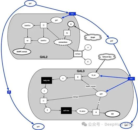 GAL3同样执行矩阵操作,但其核心功能是应用非线性函数(leaky_relu)和归一化操作(softmax)。注意力权重矩阵W_att的引入对GAL3的功能也至关重要。GAL3是以注意力机制为中心的组件。