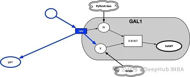 与GAL1类似,GAL4的结构也相对简单,仅执行一次矩阵乘法。它将方程的左侧gal3.left与右侧gal1.XatWT结合。GAL4是唯一一个接收来自多个组件输入的类,因此它扮演着"混合器"的角色,在"串联"和"并联"模式下连接节点特征、邻接关系和注意力机制。