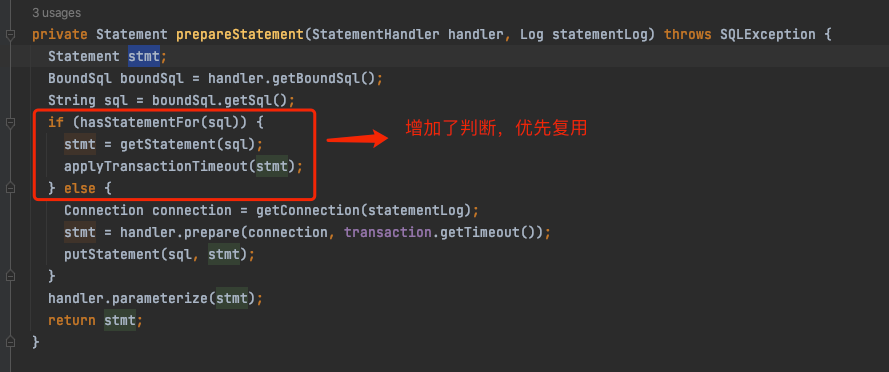 ReuseExecutor,顾名思义是可复用执行器。特点是,复用预处器PreparedStatement。