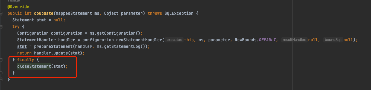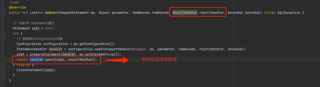 @Override public <E> List<E> doQuery(MappedStatement ms, Object parameter, RowBounds rowBounds, ResultHandler resultHandler, BoundSql boundSql) throws SQLException { // JDBC中 Statement接口 Statement stmt = null; try { // 获取到Configuration对象 Configuration configuration = ms.getConfiguration(); StatementHandler handler = configuration.newStatementHandler(wrapper, ms, parameter, rowBounds, resultHandler, boundSql); // 里面创建Connection代理对象,新增这个Statement stmt = prepareStatement(handler, ms.getStatementLog()); // 执行查询,封装结果集 return handler.query(stmt, resultHandler); } finally { closeStatement(stmt); } }