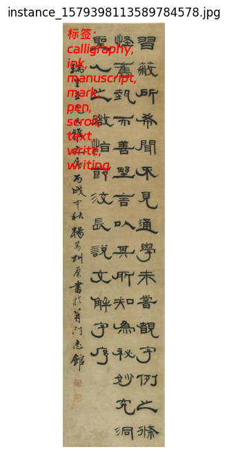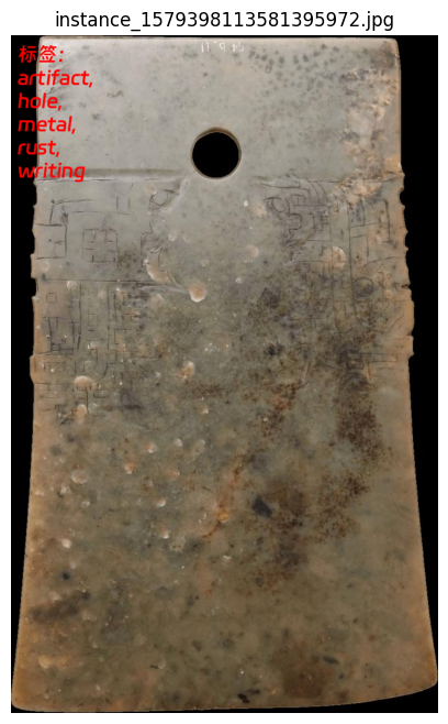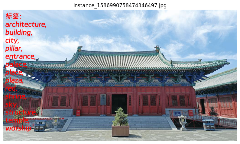 import matplotlib.pyplot as plt from PIL import Image, ImageDraw, ImageFont import os import json import random TAG_FONT_SIZE = 30 FONT_PATH = "./DingTalk JinBuTi.ttf" # 使用字体文件 TAG_COLOR = "red" # 可视化函数 def visualize_with_tags(image_path, tags): try: # 加载图片 img = Image.open(image_path) draw = ImageDraw.Draw(img) # 加载字体并设置大小 try: font = ImageFont.truetype(FONT_PATH, TAG_FONT_SIZE) except Exception as e: print('load default font') font = ImageFont.load_default() # 默认字体可能无法缩放 # 在图片左上角添加标签 tag_text = "标签:\n" + ", \n".join(tags) draw.text((10, 10), tag_text, fill=TAG_COLOR, font=font) # 显示图片 plt.figure(figsize=(10, 8)) plt.imshow(img) plt.axis("off") plt.title(os.path.basename(image_path)) plt.show() except FileNotFoundError: print(f"图片文件不存在:{image_path}") except Exception as e: print(f"处理图片时发生错误:{str(e)}") # 加载数据 with open(tag_data_path, 'r') as f: data_list = f.readlines() random.shuffle(data_list) # 有一些连续相同的图像,shuffle 显示不同的图像 # 批量可视化 for item in data_list[:3]: # 显示3个样本 item = json.loads(item) images = item['images'] tags = item['image_tags'] for i in range(len(images)): image_path = os.path.join(IMAGE_BASE_DIR, images[i]) tag = item['image_tags'][i] print(f"图片路径:{images[i]}") print(f"标注标签:{tags[i]}") visualize_with_tags(image_path, tag)