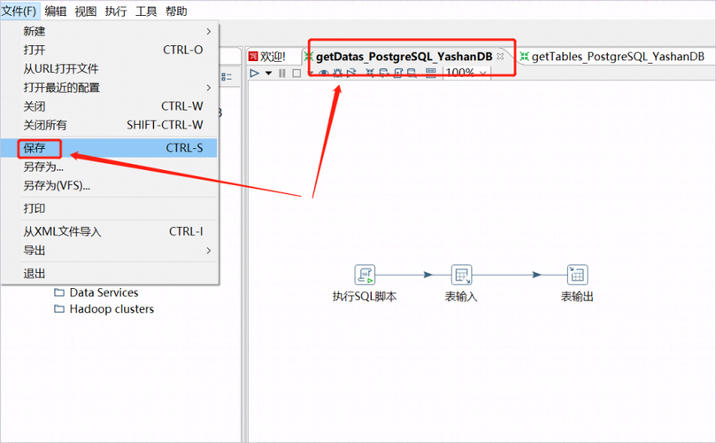 8、修改DB连接PostgreSQLInput和YashanOutput后,getDatas_PostgreSQL_YashanDB配置处于未保存状态,请务必对该任务进行保存。