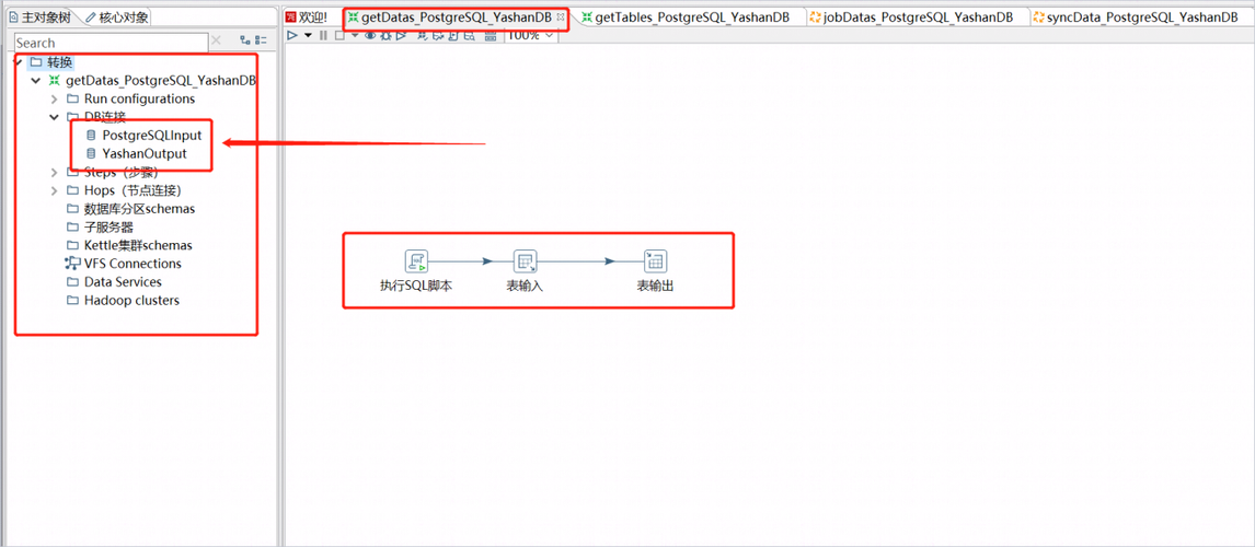 5、打开getDatas_PostgreSQL_YashanDB,这个任务是实际执行从PostgreSQL迁移数据到崖山的任务,封装了DB连接,需要根据实际环境进行调整和测试,确保后续配置DB连接PostgreSQLInput和YashanOutput的步骤都测试成功。