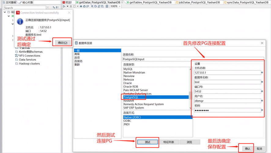 6、修改getDatas_PostgreSQL_YashanDB的DB连接PostgreSQLInput,连接类型使用PostgreSQL,然后输入PostgreSQL的主机地址、数据库名字、端口号、用户名和密码,点击“测试”,测试通过后选择“确认”。