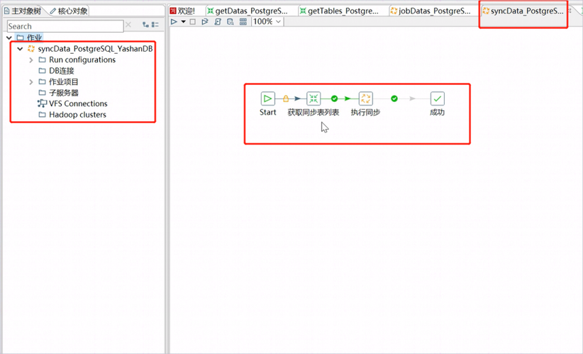 4、打开syncData_PostgreSQL_YashanDB.kjb,这个任务是总任务,它封装了多个子任务用于从PostgreSQL迁移数据到崖山。