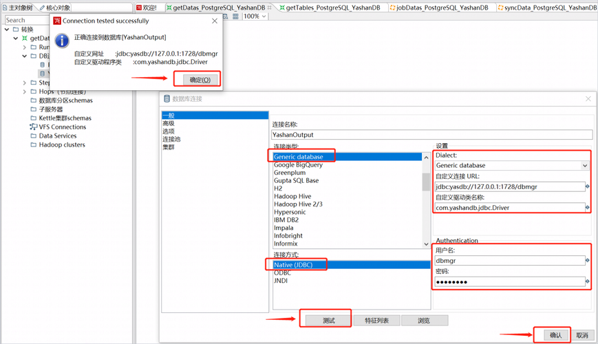 7、修改getDatas_PostgreSQL_YashanDB的DB连接YashanOutput,连接类型使用Generic database,连接方式使用Native(JDBC),设置自定义JDBC URL(jdbc:yasdb://YashanDB_IP:YashanDB_PORT/YashanDB_User)和JDBC驱动类名称,并输入用户名和密码,点击“测试”,测试通过后选择“确认”。