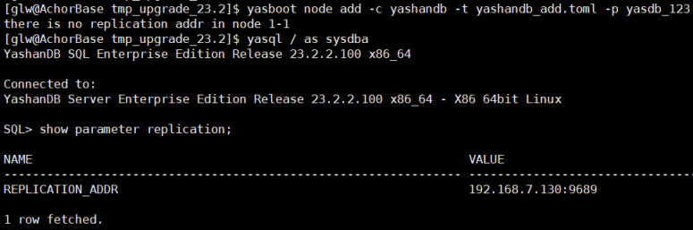 报错信息:升级到23版本的数据库按照官方文档使用yasboot执行在线扩容操作增加备节点出现报错:there is no replication addr in node 1-1