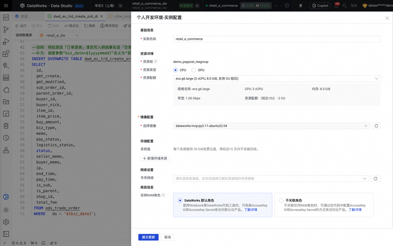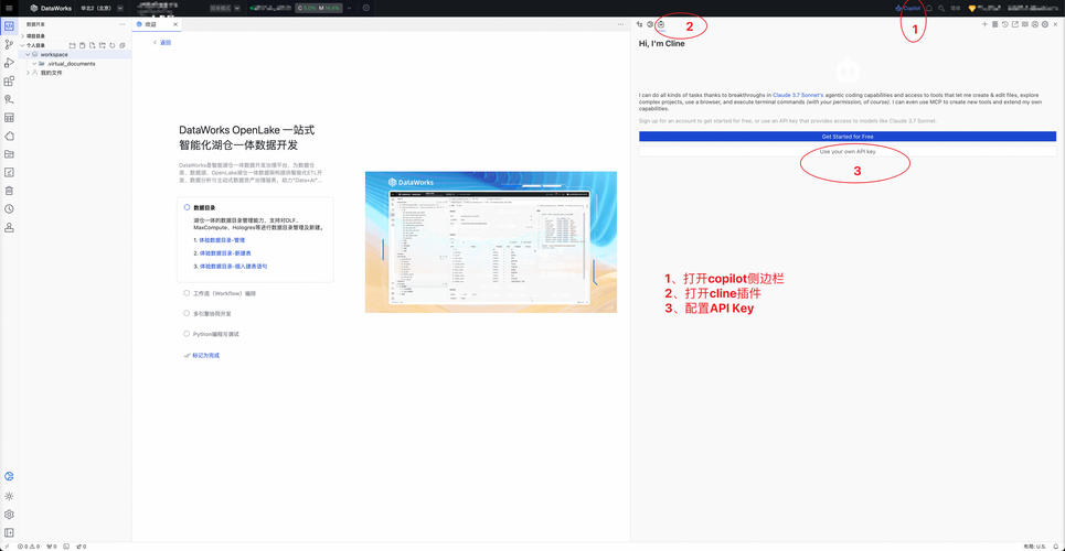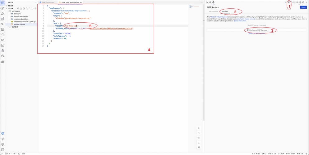 DataWorks新版数据开发的个人开发环境,在阿里云原生的能力上搭建了用户专属的开发环境,环境中内置了VSCode客户端,登录DataWorks后可通过浏览器访问,您可以选择安装MCP Client插件(如Cline),通过配置DataWorks开源的MCP Server,输入指令即可完成DataWorks的数据开发运维等动作。