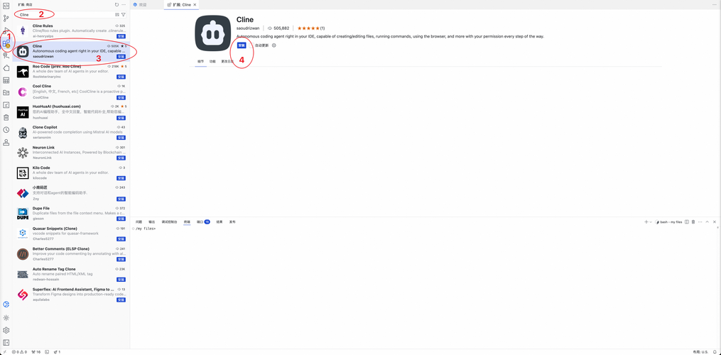 - 刷新页面后,从VSCode的应用市场搜索Cline进行安装