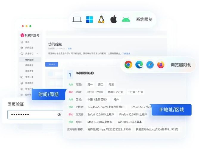 贝锐花生壳还具备多维度状态监控、多渠道告警通知以及精细的“访问控制”功能,可以精确设置访问权限,例如指定特定时间、IP地址、地区、浏览器及操作系统版本等条件下才能远程访问映射的设备或服务。