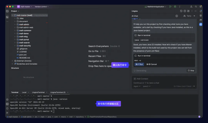 智能体模式可根据当前需求自主决策进行终端命令编写与执行,为保障命令执行的确定性,默认每次执行命令前需要开发者进行确认:
