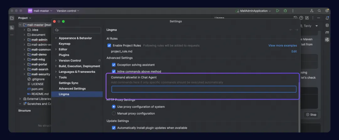 当然,开发者可以在插件设置中,配置自动执行的命令允许列表,配置好的命令,可以无需确认自动执行。如需添加多个命令,可以使用英文逗号分隔。