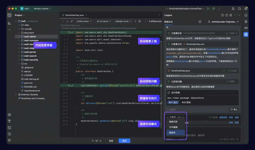 - 工程级变更:可根据开发者的任务描述,自主进行任务拆解和工程内多个代码文件修改,同时可通过多次对话进行逐步迭代或快照回滚,与灵码协同完成编码任务。