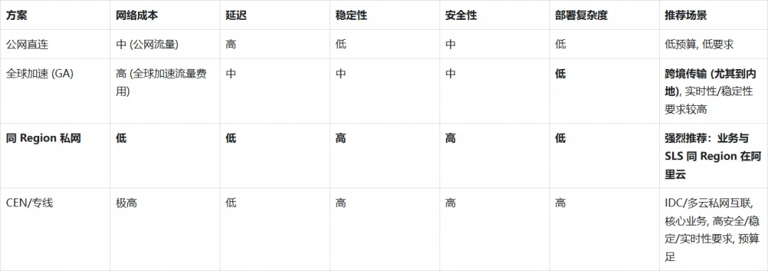 - 架构:海外服务器 (Agent in IDC/其他云 VPC) -> 物理专线/VPN/CEN -> 阿里云 VPC -> SLS 私网 Endpoint (目标 Region)