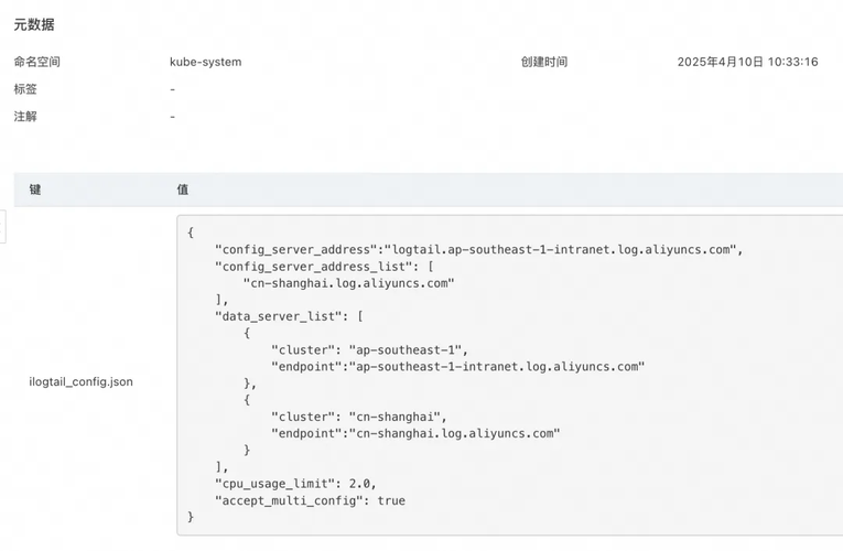 { ... "config_server_address":"http://logtail.ap-southeast-1-intranet.log.aliyuncs.com", "config_server_address_list": [ "http://cn-shanghai.log.aliyuncs.com" ], "data_server_list": [ { "cluster": "ap-southeast-1", "endpoint":"ap-southeast-1-intranet.log.aliyuncs.com" }, { "cluster": "cn-shanghai", "endpoint":"cn-shanghai.log.aliyuncs.com" // 如果需要全球加速,此处换成log-global.aliyuncs.com } ], ... }