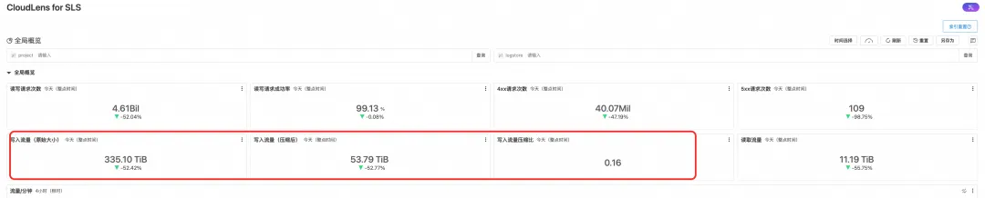 - 效果监控:用户可以通过阿里云提供的 CloudLens for SLS 功能,查看日志项目 (Project) 的写入流量压缩比等相关指标。这提供了一个直观的方式来量化压缩功能带来的实际网络带宽节省效果。