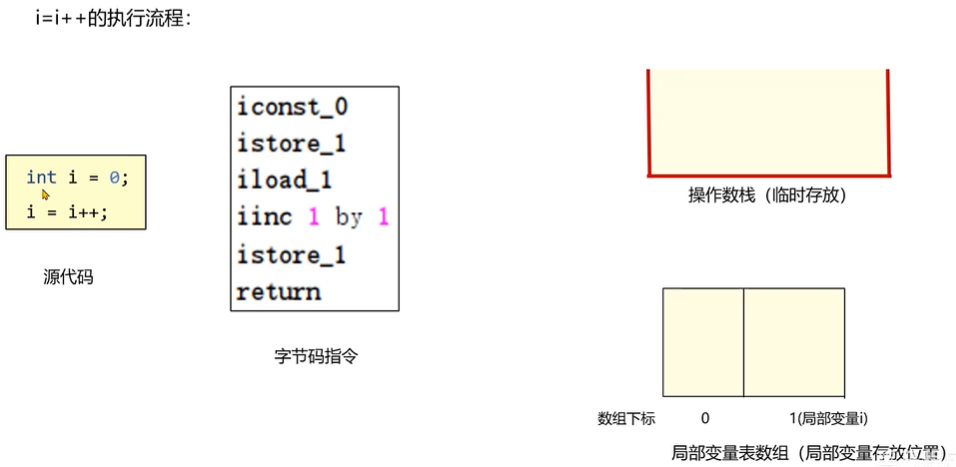 - i++:先执行iload后执行iinc,先如后加再弹,最终数据不变