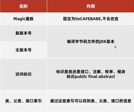 - 基础信息作用:包含了魔数,字节码对应Java版本号,访问标识,类/父类/接口的索引