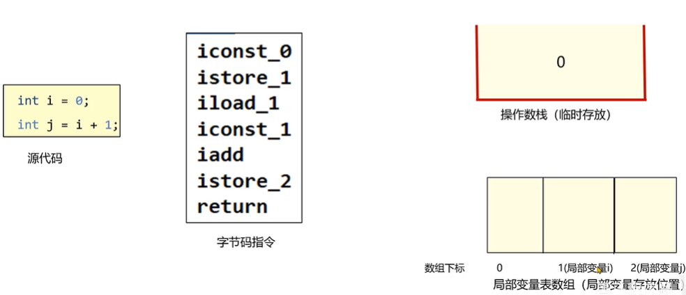 - 方法的工作流程:按照字节码指令从上至下依次执行,需要用到虚拟机栈中的两个区域:操作数栈和局部变量表