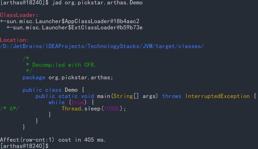 - 反编译运行时字节码为Java源码:jad org.pickstar.arthas.Demo
