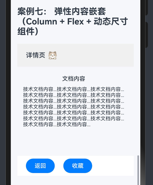 @Component export struct DetailPage { @State content: string = '技术文档内容...'.repeat(20) // 长文本模拟内容 build() { Column() { // 顶部标题栏(固定高度,嵌套Row) Row({ space: 8 }) { // 标题和图标组件 } .width('100%') .height(64) .padding({ left: 24, right: 24 }) .backgroundColor(0xF0F0F0) // 中间内容区域(弹性填充,嵌套Flex+Column) Flex() { // 内容组件 } .width('100%') .padding({ top: 24,bottom: 24, left:16, right:16 }) // 底部按钮栏(固定高度,嵌套Row) Row({ space: 24 }) { // 按钮组件 } .width('100%') .height(56) .backgroundColor(0xFFFFFF) .shadow({ radius: 4, color: 0x05000000 }) .padding({ left: 24, right: 24, bottom: 24, top: 24}) } .width('100%') .height('100%') } }