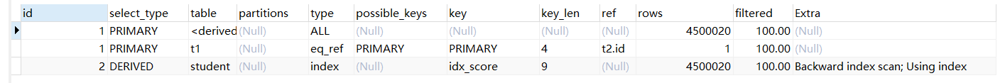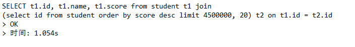 EXPLAIN SELECT t1.id, t1.name, t1.score from student t1 join (select id from student order by score desc limit 4500000, 20) t2 on t1.id = t2.id; 执行效率:效执行里面的子查询,查询走的是索引,然后再从子查询中获取到的20条数据在进行查询,查询走的是PRIMARY