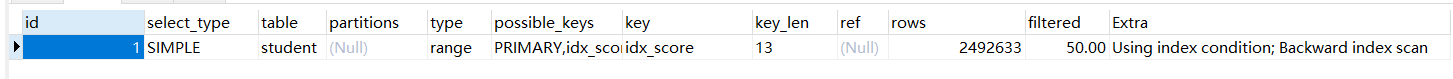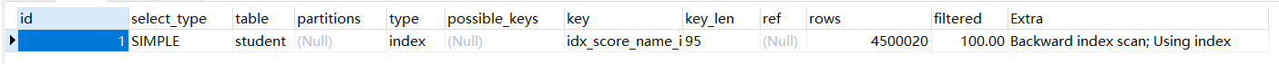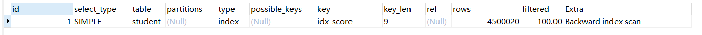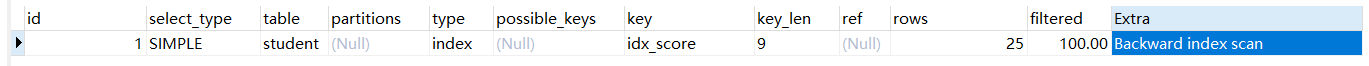 # 浅分页 EXPLAIN SELECT id, name, score from student order by score desc limit 5, 20; 执行效率:直接使用索引,额外执行Backward index scan