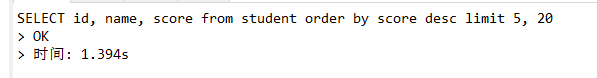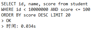 SELECT id, name, score from student WHERE id < 4975166 AND score <= 99.9 ORDER BY score DESC LIMIT 20; 7. 总结