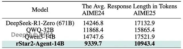 rStar2-Agent-14B用显著更少的令牌实现有效推理,这个表格比较了rStar2-Agent-14B与DeepSeek-R1-Zero、QWQ-32B和官方Qwen3-14B在AIME24和AIME25上的平均响应长度(令牌数)。它清楚地显示rStar2-Agent的响应平均短了数千个令牌。