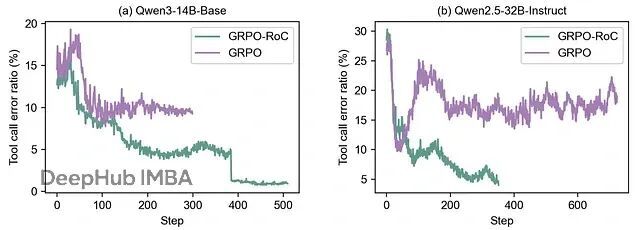这个策略的效果立竿见影。上图显示,传统GRPO方法下工具错误率很快进入平台期,而GRPO-RoC能持续降低错误率。模型不仅学会了解数学题,还在过程中成为更好的程序员和工具使用者。
