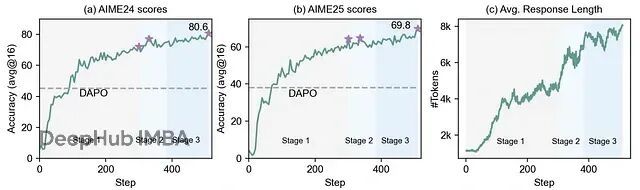 多阶段强化学习训练期间的AIME24/AIME25准确性和平均训练响应长度,这个多面板图表显示了三个强化学习训练阶段的(a) AIME24分数,(b) AIME25分数,和(c)平均响应长度。说明了性能如何稳步攀升,而响应长度以受控的方式逐阶段增长。