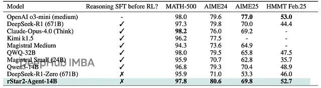 通过GRPO-RoC智能体强化学习训练,rStar2-Agent-14B在数学推理方面达到了与前沿LLMs相当的竞争力,同时使用显著更少的训练计算和更小的模型规模。