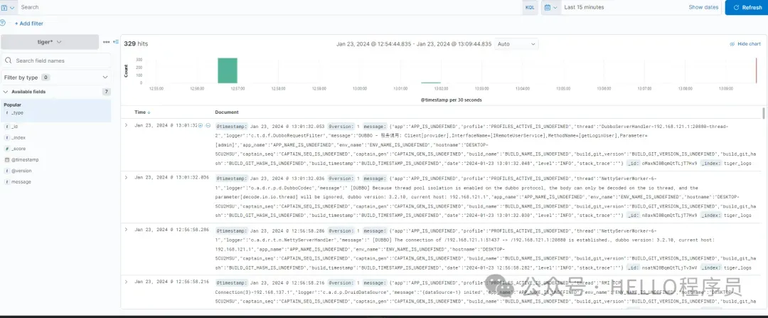 <?xml version="1.0" encoding="UTF-8"?> <configuration> <include resource="org/springframework/boot/logging/logback/defaults.xml"/> <include resource="org/springframework/boot/logging/logback/console-appender.xml"/> <!-- 这里把整个测试环境的 模块复制过来了,里面包含 输入到 kafka 的配置--> <springProfile name="dev"> <!-- 日志输出格式 --> <property name="console.log.pattern" value="%d{yyyy-MM-dd HH:mm:ss.SSS} %highlight(%-5level) --- [%green(%thread)] %cyan(%-40.40(%logger{40})) : %msg%n"/> <property name="log.pattern" value="%d{yyyy-MM-dd HH:mm:ss} [%thread] %-5level %logger{36} - %msg%n"/> <property name="log_name_prefix" value="tiger-ucenter"/> <property name="log.path" value="logs/tiger-ucenter"/> <appender name="console" class="ch.qos.logback.core.ConsoleAppender"> <encoder class="ch.qos.logback.classic.encoder.PatternLayoutEncoder"> <pattern>${console.log.pattern}</pattern> </encoder> <filter class="ch.qos.logback.classic.filter.ThresholdFilter"> <level>INFO</level> </filter> </appender> <appender name="file_info" class="ch.qos.logback.core.rolling.RollingFileAppender"> <File>${log.path}/${log_name_prefix}-info.log</File> <encoder class="ch.qos.logback.classic.encoder.PatternLayoutEncoder"> <pattern>${log.pattern}</pattern> </encoder> <filter class="ch.qos.logback.classic.filter.ThresholdFilter"> <level>INFO</level> </filter> <rollingPolicy class="ch.qos.logback.core.rolling.TimeBasedRollingPolicy"> <FileNamePattern>${log.path}/backup/${log_name_prefix}-info.%d{yyyy-MM-dd}.log </FileNamePattern> </rollingPolicy> </appender> <appender name="file_error" class="ch.qos.logback.core.rolling.RollingFileAppender"> <File>${log.path}/${log_name_prefix}-error.log</File> <encoder class="ch.qos.logback.classic.encoder.PatternLayoutEncoder"> <pattern>${log.pattern}</pattern> </encoder> <filter class="ch.qos.logback.classic.filter.ThresholdFilter"> <level>ERROR</level> </filter> <rollingPolicy class="ch.qos.logback.core.rolling.TimeBasedRollingPolicy"> <FileNamePattern>${log.path}/backup/${log_name_prefix}-error.%d{yyyy-MM-dd}.log </FileNamePattern> </rollingPolicy> </appender> <!-- kafka的appender配置--> <appender name="kafkaAppender" class="com.github.danielwegener.logback.kafka.KafkaAppender"> <encoder class="net.logstash.logback.encoder.LoggingEventCompositeJsonEncoder"> <providers class="net.logstash.logback.composite.loggingevent.LoggingEventJsonProviders"> <pattern> <pattern> {"app":"${APP}", "profile":"${PROFILES_ACTIVE}", "thread": "%thread", "logger": "%logger{5}", "message":"%msg", "app_name":"${APP_NAME}", "env_name":"${ENV_NAME}", "hostname":"${HOSTNAME}", "captain_seq":"${CAPTAIN_SEQ}", "captain_gen":"${CAPTAIN_GEN}", "build_name":"${BUILD_NAME}", "build_git_version":"${BUILD_GIT_VERSION}", "build_git_hash":"${BUILD_GIT_HASH}", "build_timestamp":"${BUILD_TIMESTAMP}", "date":"%d{yyyy-MM-dd HH:mm:ss.SSS}", "level":"%level", "stack_trace":"%exception" } </pattern> </pattern> </providers> </encoder> <topic>tiger-log</topic> <keyingStrategy class="com.github.danielwegener.logback.kafka.keying.NoKeyKeyingStrategy"/> <deliveryStrategy class="com.github.danielwegener.logback.kafka.delivery.AsynchronousDeliveryStrategy"/> <producerConfig>bootstrap.servers=192.168.137.1:9092</producerConfig> <producerConfig>retries=1</producerConfig> <producerConfig>batch-size=16384</producerConfig> <producerConfig>buffer-memory=33554432</producerConfig> <producerConfig>properties.max.request.size==2097152</producerConfig> <appender-ref ref="console"/> </appender> <root level="INFO"> <appender-ref ref="console"/> <appender-ref ref="file_error"/> <appender-ref ref="file_info"/> <appender-ref ref="kafkaAppender"/> </root> </springProfile> </configuration>
