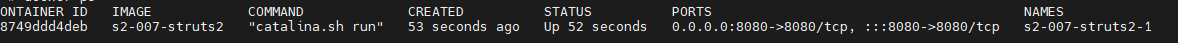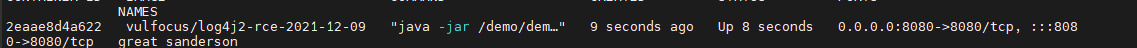 # 拉取容器 docker pull vulfocus/log4j2-rce-2021-12-09 # 启动 docker run -tid -p 8080:8080 vulfocus/log4j2-rce-2021-12-09 # 查看状态 docker ps