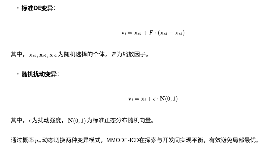 传统DE算法易陷入局部最优,MMODE-ICD通过结合两种变异策略提升全局搜索能力: