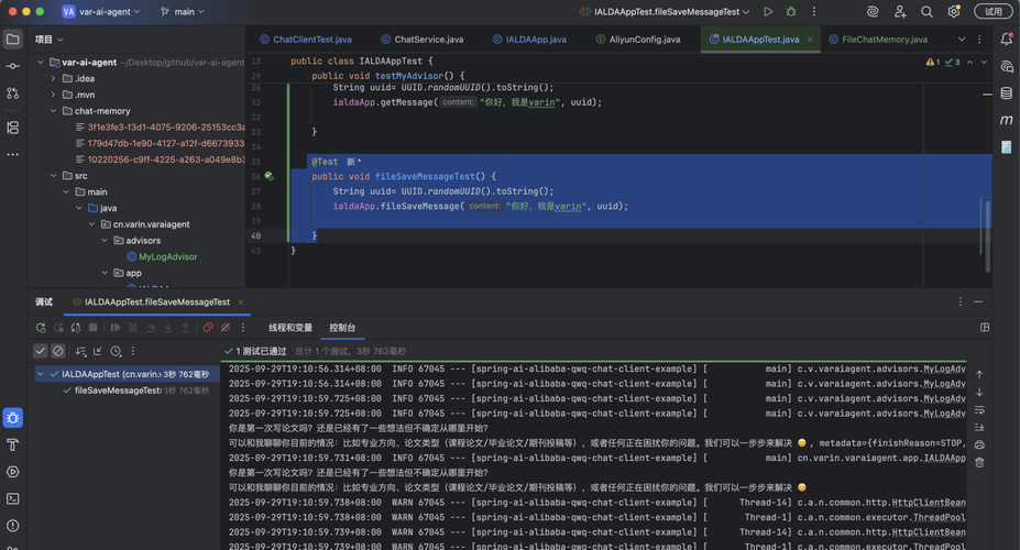 @Test public void testMyAdvisor() { String uuid= UUID.randomUUID().toString(); ialdaApp.getMessage("你好,我是varin", uuid); }