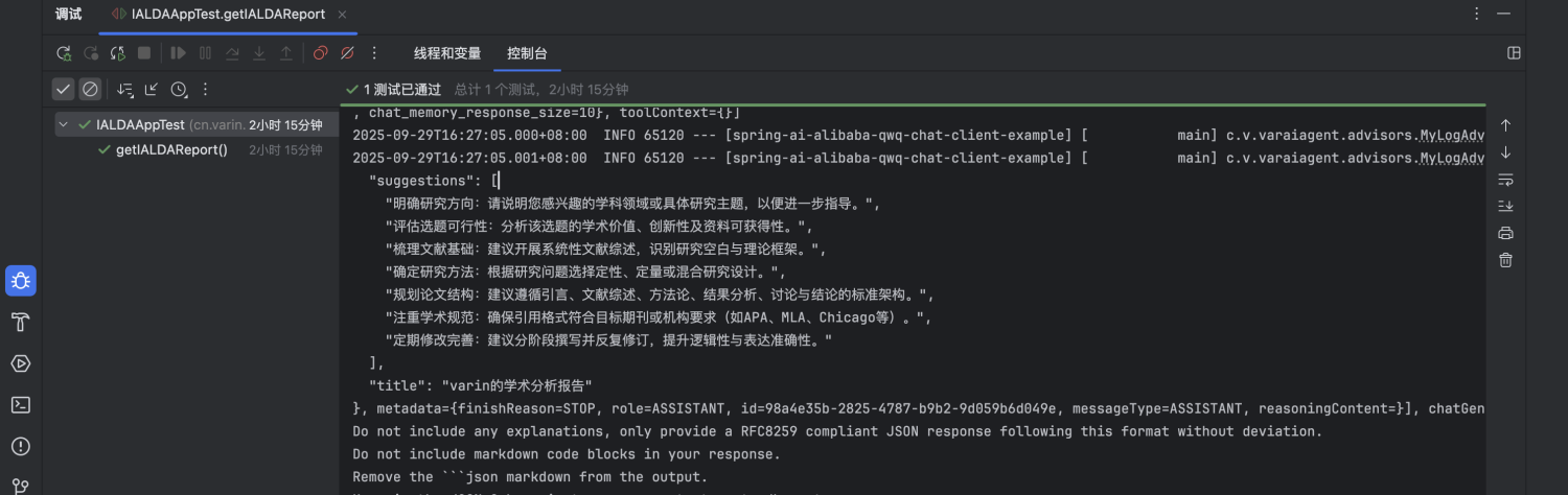 Here is the JSON Schema instance your output must adhere to: ```{ "$schema" : "https://json-schema.org/draft/2020-12/schema", "type" : "object", "properties" : { "suggestions" : { "type" : "array", "items" : { "type" : "string" } }, "title" : { "type" : "string" } }, "additionalProperties" : false }``` , chat_memory_response_size=10}, toolContext={}] 2025-09-29T16:27:05.000+08:00 INFO 65120 --- [spring-ai-alibaba-qwq-chat-client-example] [ main] c.v.varaiagent.advisors.MyLogAdvisor : afterName:varin 2025-09-29T16:27:05.001+08:00 INFO 65120 --- [spring-ai-alibaba-qwq-chat-client-example] [ main] c.v.varaiagent.advisors.MyLogAdvisor : advisedRequest:AdvisedResponse[response=ChatResponse [metadata={ id: 98a4e35b-2825-4787-b9b2-9d059b6d049e, usage: TokenUsage[outputTokens=181, inputTokens=301, totalTokens=482], rateLimit: org.springframework.ai.chat.metadata.EmptyRateLimit@7a57c5d9 }, generations=[Generation[assistantMessage=AssistantMessage [messageType=ASSISTANT, toolCalls=[], textContent={ "suggestions": [ "明确研究方向:请说明您感兴趣的学科领域或具体研究主题,以便进一步指导。", "评估选题可行性:分析该选题的学术价值、创新性及资料可获得性。", "梳理文献基础:建议开展系统性文献综述,识别研究空白与理论框架。", "确定研究方法:根据研究问题选择定性、定量或混合研究设计。", "规划论文结构:建议遵循引言、文献综述、方法论、结果分析、讨论与结论的标准架构。", "注重学术规范:确保引用格式符合目标期刊或机构要求(如APA、MLA、Chicago等)。", "定期修改完善:建议分阶段撰写并反复修订,提升逻辑性与表达准确性。" ], "title": "varin的学术分析报告" }, metadata={finishReason=STOP, role=ASSISTANT, id=98a4e35b-2825-4787-b9b2-9d059b6d049e, messageType=ASSISTANT, reasoningContent=}], chatGenerationMetadata=DefaultChatGenerationMetadata[finishReason='STOP', filters=0, metadata=0]]]], adviseContext={chat_memory_conversation_id=e916e02b-437b-4630-951f-746927421b1b, formatParam=Your response should be in JSON format. Do not include any explanations, only provide a RFC8259 compliant JSON response following this format without deviation. Do not include markdown code blocks in your response. Remove the ```json markdown from the output. Here is the JSON Schema instance your output must adhere to: ```{ "$schema" : "https://json-schema.org/draft/2020-12/schema", "type" : "object", "properties" : { "suggestions" : { "type" : "array", "items" : { "type" : "string" } }, "title" : { "type" : "string" } }, "additionalProperties" : false }``` ,