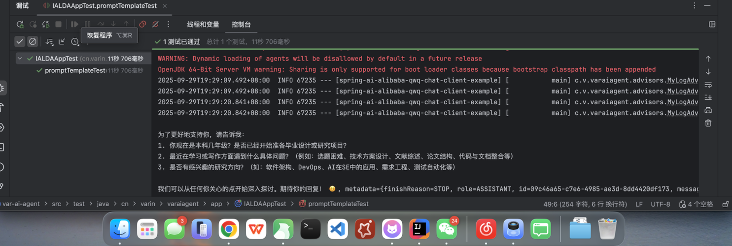 /Users/varya/Library/Java/JavaVirtualMachines/corretto-21.0.8/Contents/Home/bin/java -agentlib:jdwp=transport=dt_socket,address=127.0.0.1:62954,suspend=y,server=n -javaagent:/Users/varya/Library/Caches/JetBrains/IntelliJIdea2025.2/captureAgent/debugger-agent.jar=file:///var/folders/3x/q93yq50j1_nc092fh57488bm0000gn/T/capture10569107792162395090.props -ea -agentpath:/private/var/folders/3x/q93yq50j1_nc092fh57488bm0000gn/T/idea_libasyncProfiler_dylib_temp_folder/libasyncProfiler.dylib=version,jfr,event=wall,interval=10ms,cstack=no,file=/Users/varya/IdeaSnapshots/IALDAAppTest_testMyAdvisor_2025_09_29_132227.jfr,log=/private/var/folders/3x/q93yq50j1_nc092fh57488bm0000gn/T/IALDAAppTest_testMyAdvisor_2025_09_29_132227.jfr.log.txt,logLevel=DEBUG -Didea.test.cyclic.buffer.size=1048576 -Dkotlinx.coroutines.debug.enable.creation.stack.trace=false -Ddebugger.agent.enable.coroutines=true -Dkotlinx.coroutines.debug.enable.flows.stack.trace=true -Dkotlinx.coroutines.debug.enable.mutable.state.flows.stack.trace=true -Dfile.encoding=UTF-8 -Dsun.stdout.encoding=UTF-8 -Dsun.stderr.encoding=UTF-8 -classpath /Users/varya/.m2/repository/org/junit/platform/junit-platform-launcher/1.11.4/junit-platform-launcher-1.11.4.jar:/Applications/IntelliJ IDEA.app/Contents/lib/idea_rt.jar:/Applications/IntelliJ IDEA.app/Contents/plugins/junit/lib/junit5-rt.jar:/Applications/IntelliJ IDEA.app/Contents/plugins/junit/lib/junit-rt.jar:/Users/varya/Desktop/github/var-ai-agent/target/test-classes:/Users/varya/Desktop/github/var-ai-agent/target/classes:/Users/varya/.m2/repository/org/springframework/boot/spring-boot-starter-web/3.4.10/spring-boot-starter-web-3.4.10.jar:/Users/varya/.m2/repository/org/springframework/boot/spring-boot-starter/3.4.10/spring-boot-starter-3.4.10.jar:/Users/varya/.m2/repository/org/springframework/boot/spring-boot/3.4.10/spring-boot-3.4.10.jar:/Users/varya/.m2/repository/org/springframework/boot/spring-boot-autoconfigure/3.4.10/spring-boot-autoconfigure-3.4.10.jar:/Users/varya/.m2/repository/org/springframework/boot/spring-boot-starter-logging/3.4.10/spring-boot-starter-logging-3.4.10.jar:/Users/varya/.m2/repository/ch/qos/logback/logback-classic/1.5.18/logback-classic-1.5.18.jar:/Users/varya/.m2/repository/ch/qos/logback/logback-core/1.5.18/logback-core-1.5.18.jar:/Users/varya/.m2/repository/org/apache/logging/log4j/log4j-to-slf4j/2.24.3/log4j-to-slf4j-2.24.3.jar:/Users/varya/.m2/repository/org/apache/logging/log4j/log4j-api/2.24.3/log4j-api-2.24.3.jar:/Users/varya/.m2/repository/org/slf4j/jul-to-slf4j/2.0.17/jul-to-slf4j-2.0.17.jar:/Users/varya/.m2/repository/jakarta/annotation/jakarta.annotation-api/2.1.1/jakarta.annotation-api-2.1.1.jar:/Users/varya/.m2/repository/org/yaml/snakeyaml/2.3/snakeyaml-2.3.jar:/Users/varya/.m2/repository/org/springframework/boot/spring-boot-starter-json/3.4.10/spring-boot-starter-json-3.4.10.jar:/Users/varya/.m2/repository/com/fasterxml/jackson/core/jackson-databind/2.18.4/jackson-databind-2.18.4.jar:/Users/varya/.m2/repository/com/fasterxml/jackson/datatype/jackson-datatype-jdk8/2.18.4/jackson-datatype-jdk8-2.18.4.jar:/Users/varya/.m2/repository/com/fasterxml/jackson/datatype/jackson-datatype-jsr310/2.18.4/jackson-datatype-jsr310-2.18.4.jar:/Users/varya/.m2/repository/com/fasterxml/jackson/module/jackson-module-parameter-names/2.18.4/jackson-module-parameter-names-2.18.4.jar:/Users/varya/.m2/repository/org/springframework/boot/spring-boot-starter-tomcat/3.4.10/spring-boot-starter-tomcat-3.4.10.jar:/Users/varya/.m2/repository/org/apache/tomcat/embed/tomcat-embed-core/10.1.46/tomcat-embed-core-10.1.46.jar:/Users/varya/.m2/repository/org/apache/tomcat/embed/tomcat-embed-el/10.1.46/tomcat-embed-el-10.1.46.jar:/Users/varya/.m2/repository/org/apache/tomcat/embed/tomcat-embed-websocket/10.1.46/tomcat-embed-websocket-10.1.46.jar:/Users/varya/.m2/repository/org/springframework/spring-web/6.2.11/spring-web-6.2.11.jar:/Users/varya/.m2/repository/org/springframework/spring-beans/6.2.11/spring-beans-6.2.11.jar:/Users/varya/.m2/repository/io/micrometer/micrometer-observation/1.14.11/micrometer-observation-1.14.11.jar:/Users/varya/.m2/repository/io/micrometer/micrometer-commons/1.14.11/micrometer-commons-1.14.11.jar:/Users/varya/.m2/repository/org/springframework/spring-webmvc/6.2.11/spring-webmvc-6.2.11.jar:/Users/varya/.m2/repository/org/springframework/spring-aop/6.2.11/spring-aop-6.2.11.jar:/Users/varya/.m2/repository/org/springframework/spring-context/6.2.11/spring-context-6.2.11.jar:/Users/varya/.m2/repository/org/springframework/spring-expression/6.2.11/spring-expression-6.2.11.jar:/Users/varya/.m2/repository/org/projectlombok/lombok/1.18.40/lombok-1.18.40.jar:/Users/varya/.m2/repository/org/springframework/boot/spring-boot-starter-test/3.4.10/spring-boot-starter-test-3.4.10.jar:/Users/varya/.m2/repository/org/springframework/boot/spring-boot-test/3.4.10/spring-boot-test-3.4.10.jar:/Users/varya/.m2/repository/org/springframework/boot/spring-boot-test-autoconfigure/3.4.10/spring-boot-test-autoconfigure-3.4.10.jar:/Users/varya/.m2/repository/com/jayway/jsonpath/json-path/2.9.0/json-path-2.9.0.jar:/Users/varya/.m2/repository/jakarta/xml/bind/jakarta.xml.bind-api/4.0.2/jakarta.xml.bind-api-4.0.2.jar:/Users/varya/.m2/repository/jakarta/activation/jakarta.activation-api/2.1.4/jakarta.activation-api-2.1.4.jar:/Users/varya/.m2/repository/net/minidev/json-smart/2.5.2/json-smart-2.5.2.jar:/Users/varya/.m2/repository/net/minidev/accessors-smart/2.5.2/accessors-smart-2.5.2.jar:/Users/varya/.m2/repository/org/ow2/asm/asm/9.7.1/asm-9.7.1.jar:/Users/varya/.m2/repository/org/assertj/assertj-core/3.26.3/assertj-core-3.26.3.jar:/Users/varya/.m2/repository/net/bytebuddy/byte-buddy/1.15.11/byte-buddy-1.15.11.jar:/Users/varya/.m2/repository/org/awaitility/awaitility/4.2.2/awaitility-4.2.2.jar:/Users/varya/.m2/repository/org/hamcrest/hamcrest/2.2/hamcrest-2.2.jar:/Users/varya/.m2/repository/org/junit/jupiter/junit-jupiter/5.11.4/junit-jupiter-5.11.4.jar:/Users/varya/.m2/repository/org/junit/jupite