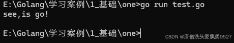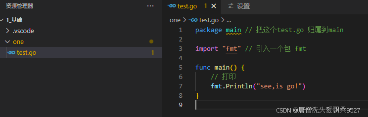 package main // 把这个test.go 归属到main import "fmt" // 引入一个包 fmt func main() { // 打印 fmt.Println("see,is\n", "go!") }